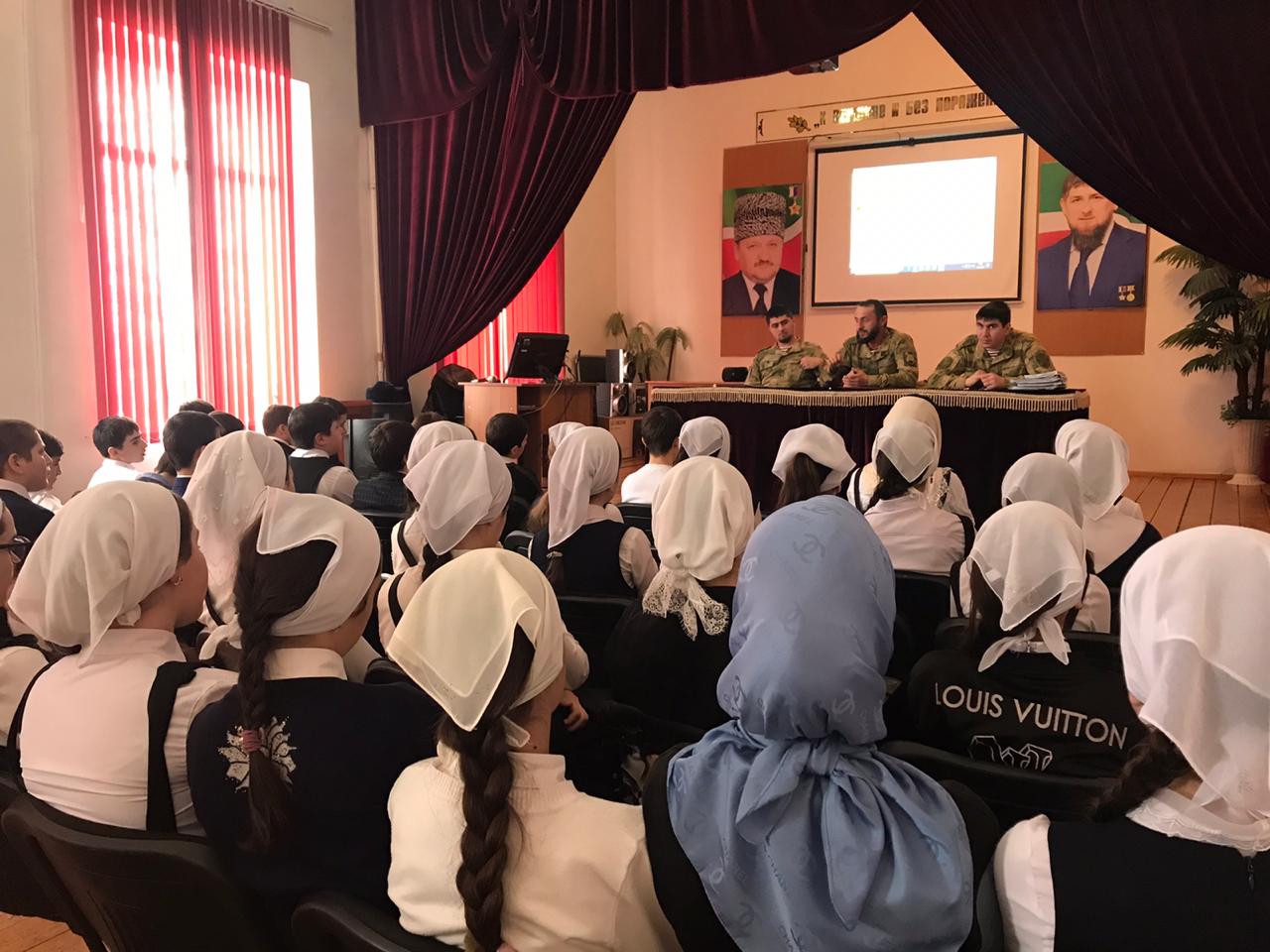 14.02.2020В целях реализации школьного плана графика мероприятий ко Дню Защитника Отечества в школе прошла встреча учащихся 6, 7 классов с представителями в/ч 4157. В беседе с учащимися, военнослужащие рассказали подвиге нашего земляка героя Советского Союза Ханпаши Нурадилова, жизни и быте военнослужащих части, расположенной в с. Ведено. В ходе встречи прошла демонстрация аудио видео файлов на тему: «Герои Отечества».