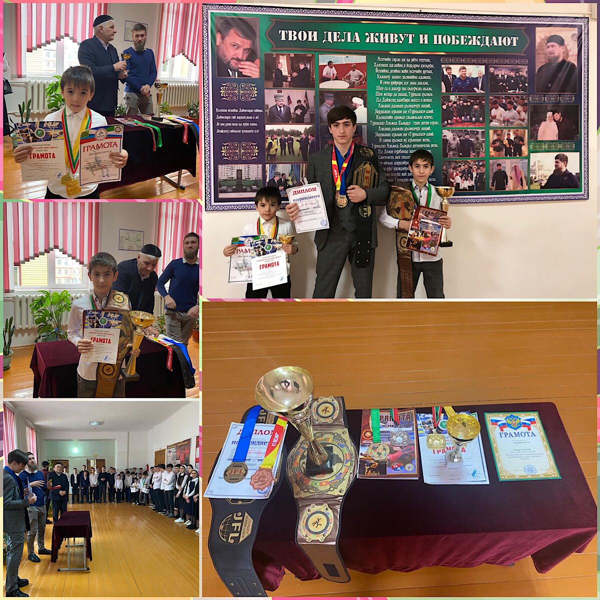 Школьная линейка, посвященная чествованию победителей и призёров.11 марта 2022года в МБОУ « Веденская СОШ № 1» состоялась торжественная церемония награждения учащихся, ставших победителями и призёрами Всероссийских, региональных спортивных состязаний по грепплингу, вольной борьбе, муниципального этапа Всероссийской олимпиады.Бибулатов Абубакар-Сиддик Хусенович ученик 9а класса, занял 3 место во Всероссийском спортивном состязании по грепплингу в г. Москве. Награждён грамотой, медалью, кубком, поясом чемпиона.Халиев Мустафа ученик 1 класса, занял 1 место на открытом турнире по бразильскому джиу – джитсу " Grozny Cup», в открытом турнире по вольной борьбе в рамках реализации регионального проекта « СПОРТ НОРМА ЖИЗНИ». Награждён грамотами, медалями, кубком, поясом чемпиона.Халиев Ибрагим ученик 5 класса занял 1 место на открытом турнире по бразильскому джиу – джитсу " Grozny Cup». Награждён грамотой, медалью, кубком.Мадаев Тамерлан Русланович ученик 11 класса занял 1 место в муниципальном турнире по шахматам. Награждён грамотой.Чатаев Муса Бекханович ученик 11 класса победитель муниципального этапа Всероссийской олимпиады по физической культуре. Награждён грамотой.Мадаева Радима Султановна ученица 11 класса, Султанова Амина Руслановна ученица 5 класса, Темиргиреева Сафия Абухасановна ученица 7 класса победители муниципального этапа Всероссийской олимпиады по географии. Награждены грамотами.Досуева Сурана Тимуровна ученица 8 класса победитель муниципального этапа Всероссийской олимпиады по математике. Награждена грамотой.Дамашева Селима Тамерлановна ученица 6 класса победитель муниципального этапа Всероссийской олимпиады по русскому языку. Награждена грамотой.В праздничной обстановке директор школы Алмасханова Элина Магомедовна, педагог по ДНВ Аюбов Адам Тагирович, поздравили учащихся с победой, пожелали всем учащимся добиться ещё больших успехов в учебе, спорте. Теплые слова благодарности прозвучали в адрес учителей, подготовивших победителей муниципального этапа Всероссийской олимпиады. Благодаря профессионализму и каждодневному труду педагогов ежегодно растет число разносторонне образованных и интеллектуально одаренных школьников.Участие в данном мероприятии дает бесценный опыт, с помощью которого можно оставить свой след в школьной летописи.В заключение торжественной части мероприятия, после всех поздравлений и пожеланий, победители и призеры запечатлелись на общем фото.Мероприятие получилось захватывающим, оставило массу положительных эмоций и впечатлений.