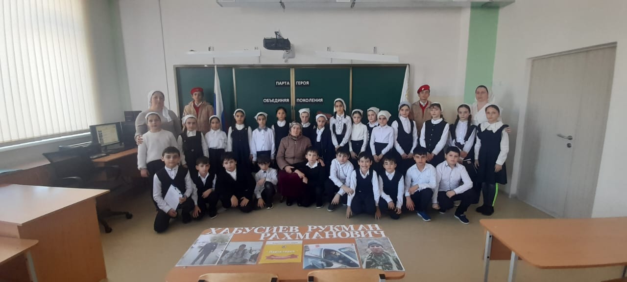 13.02. 2023 года в МБОУ « Веденская СОШ № 1» в рамках реализации нацпроекта «Образование», прошло торжественное мероприятие в начальной школе « Парта Героя», посвященное выпускнику образовательного учреждения, лейтенанту полиции, инспектору дорожно – патрульной службы спец батальона ДПС государственной инспекции безопасности дорожного движения оперативного реагирования МВД по Чеченской Республике Хабусиеву Рукману Рахмановичу, который погиб при исполнении служебного долга в г. Грозном 3 декабря 2014 года, защитив покой мирных граждан от посягательств вооруженных преступников.