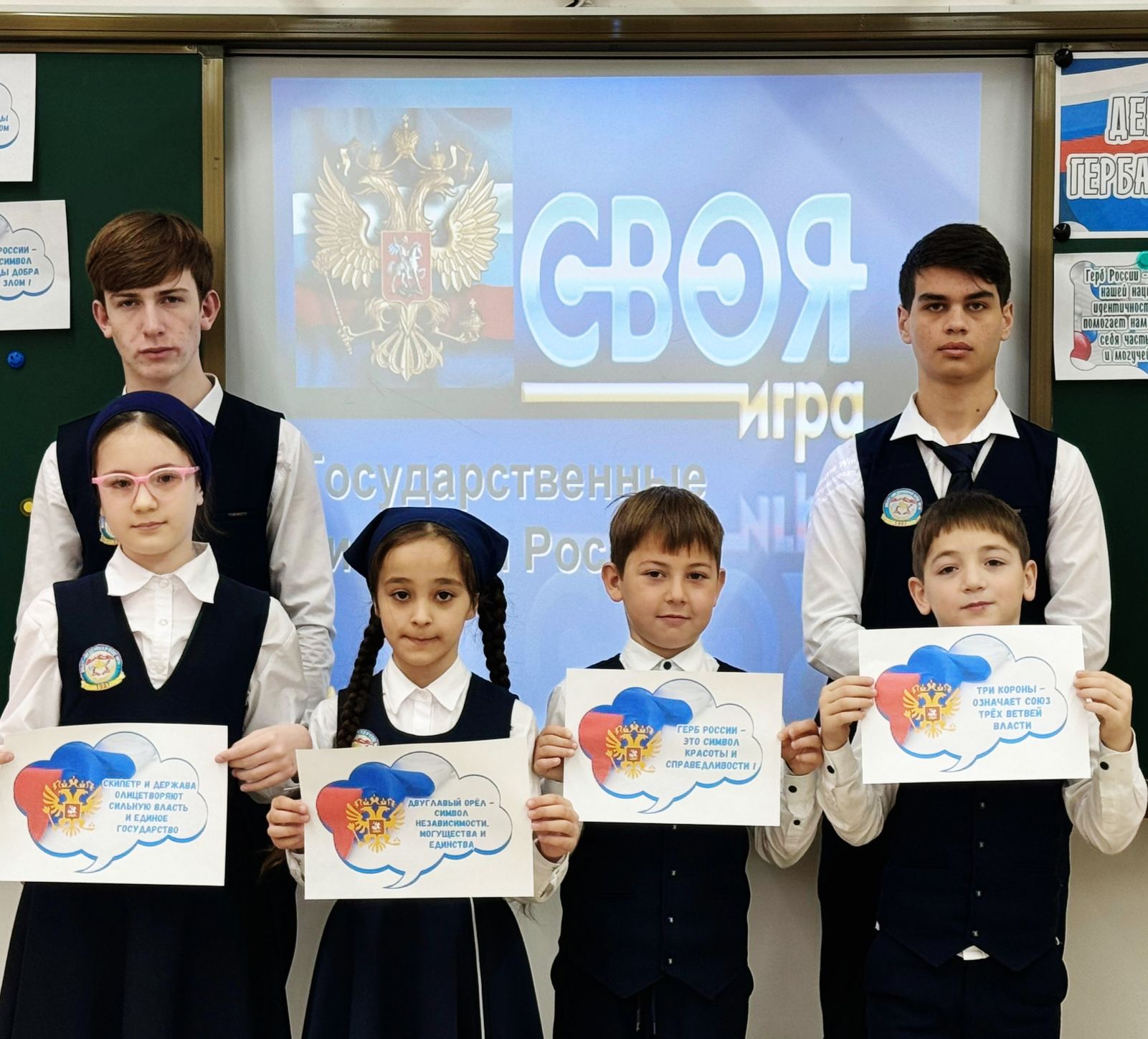 Игра включала в себя несколько раундов, где ребята отвечали на вопросы о государственных символах, об истории и значении герба, флага и гимна России.