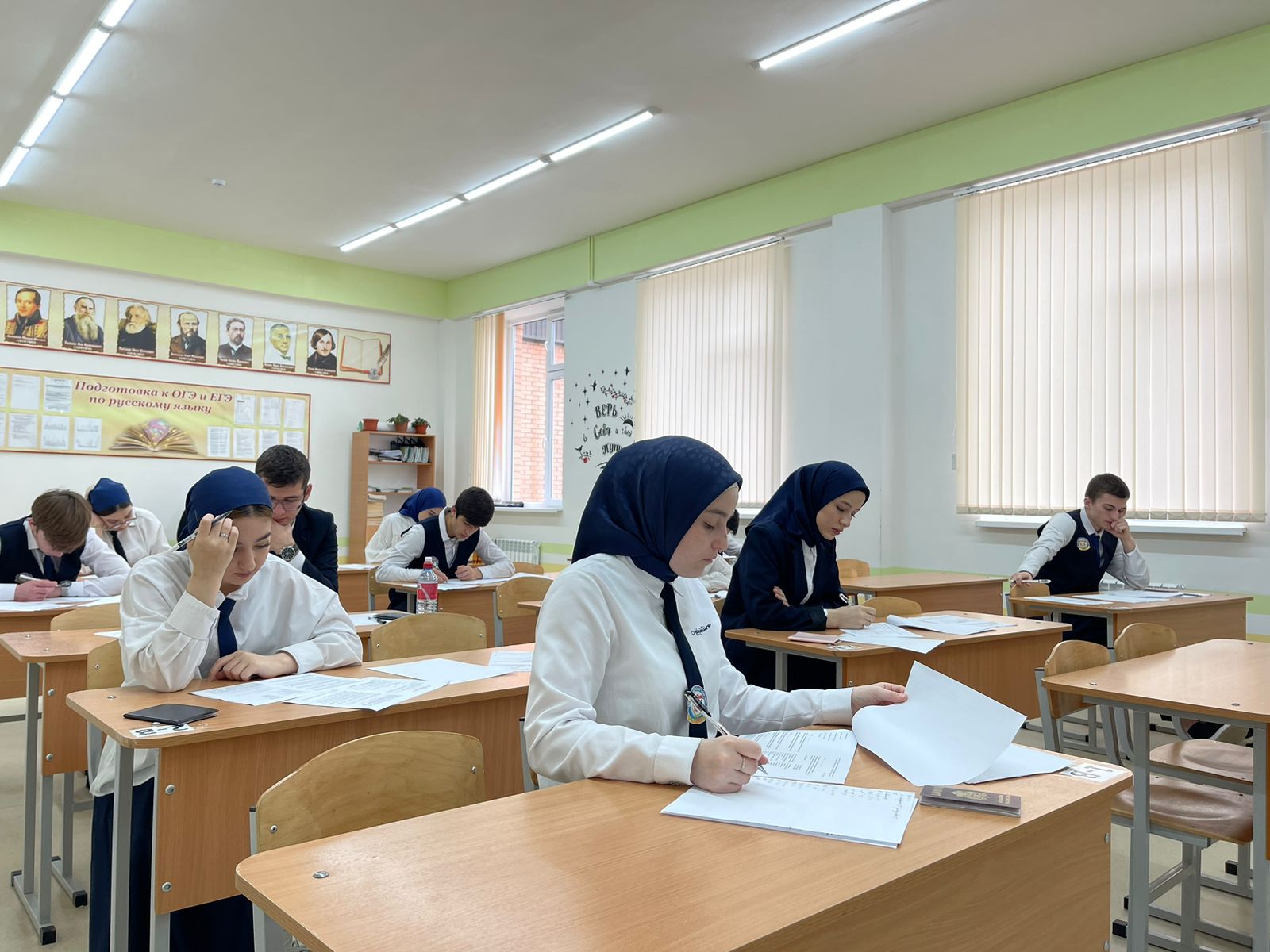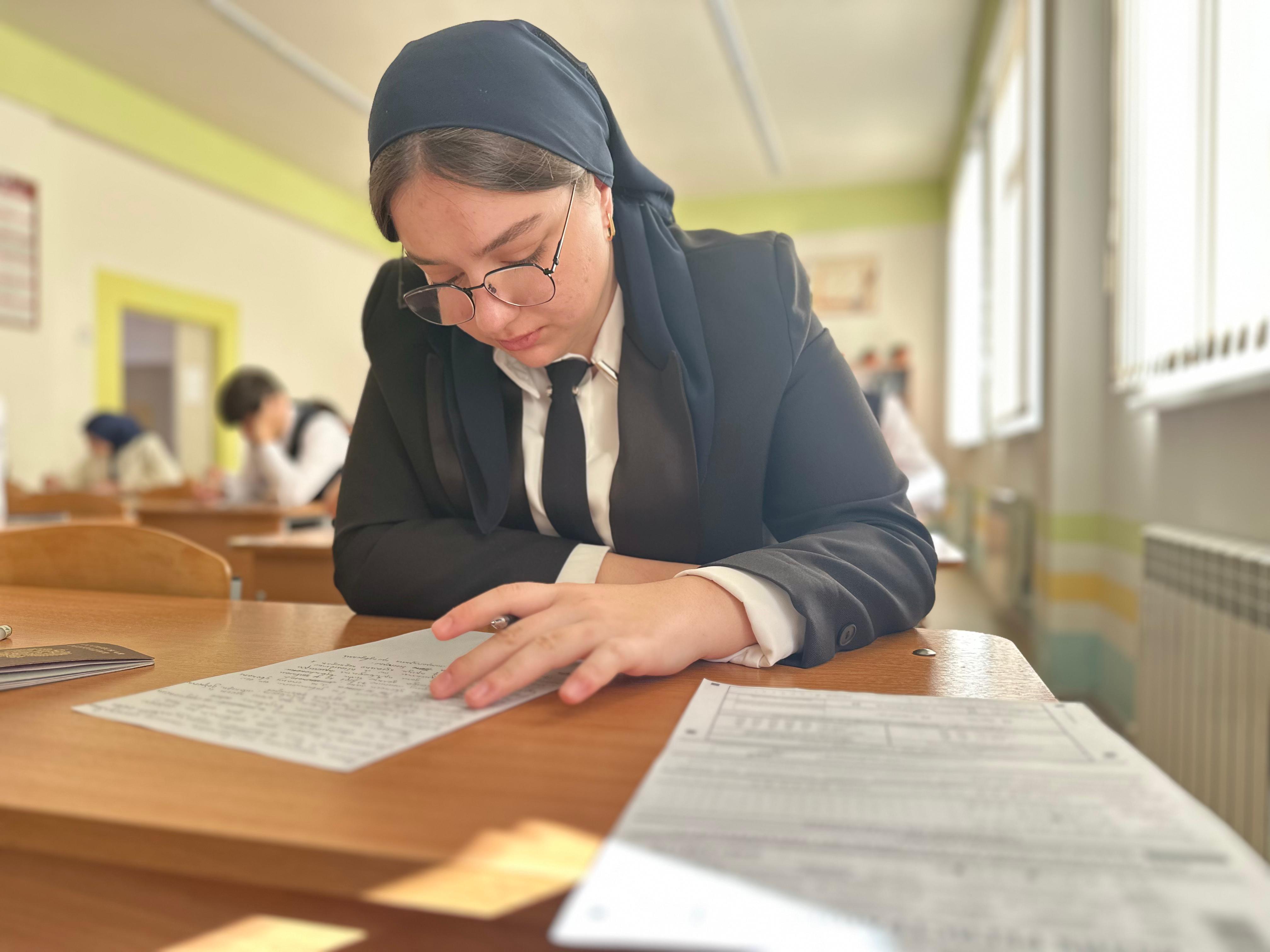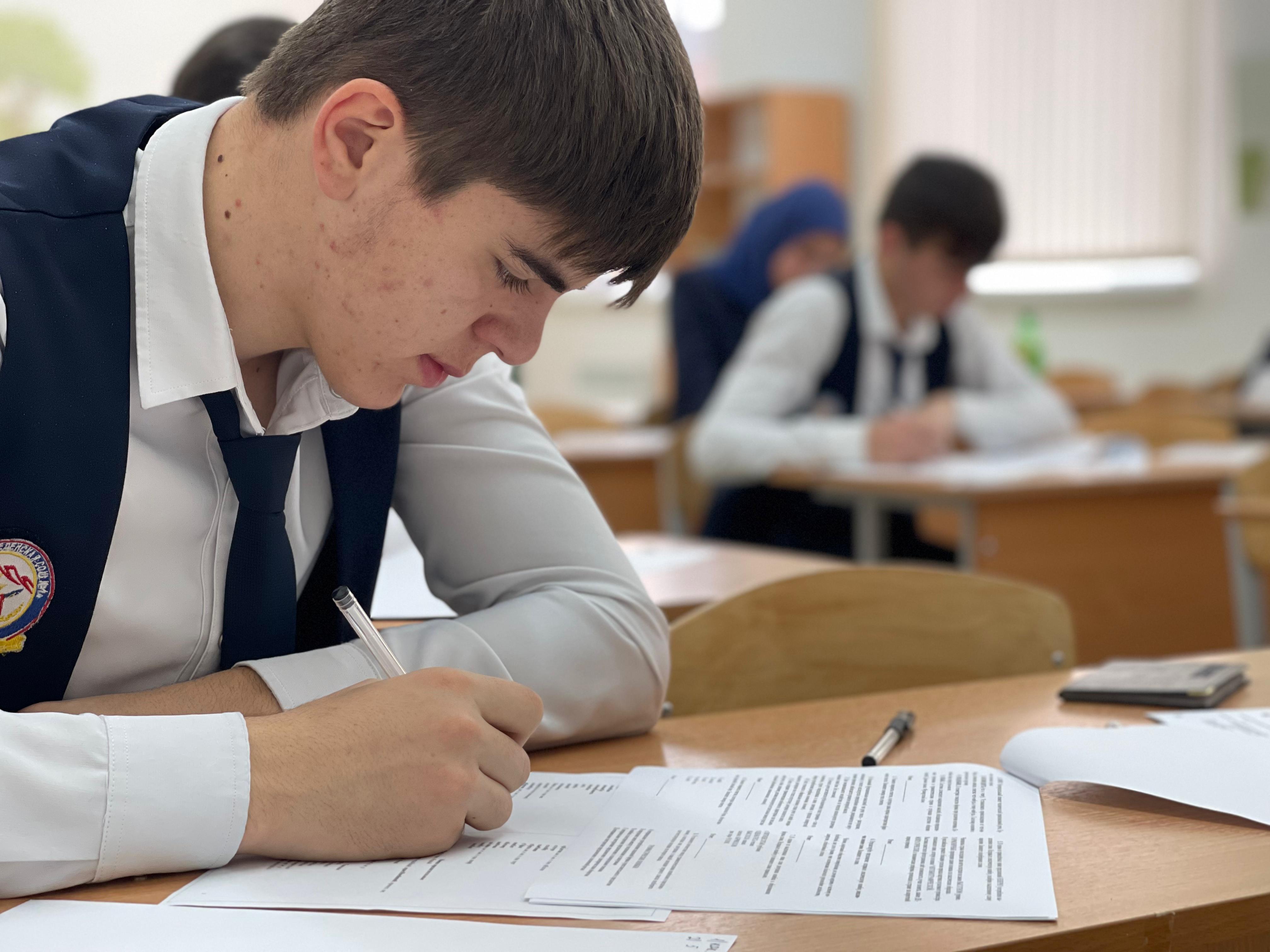 В МБОУ "Веденская СОШ №1" учащиеся 11 класса сдают пробное ЕГЭ по русскому языку.